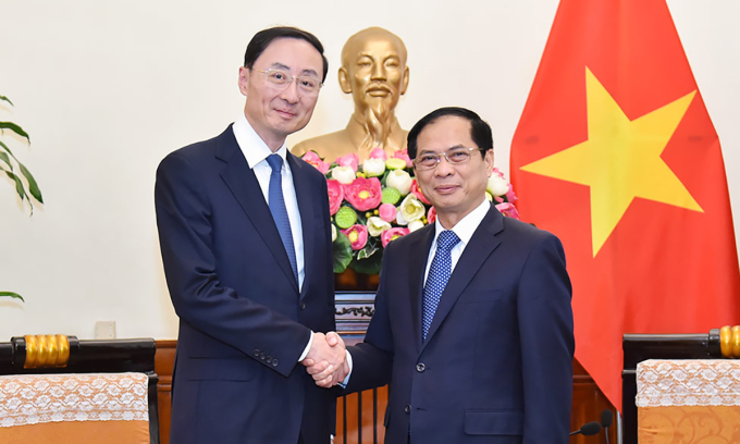 Bộ trưởng Ngoại giao Bùi Thanh Sơn (phải) và Thứ trưởng Ngoại giao Trung Quốc Tôn Vệ Đông trong buổi tiếp tại Hà Nội ngày 9/11. Ảnh: BNG