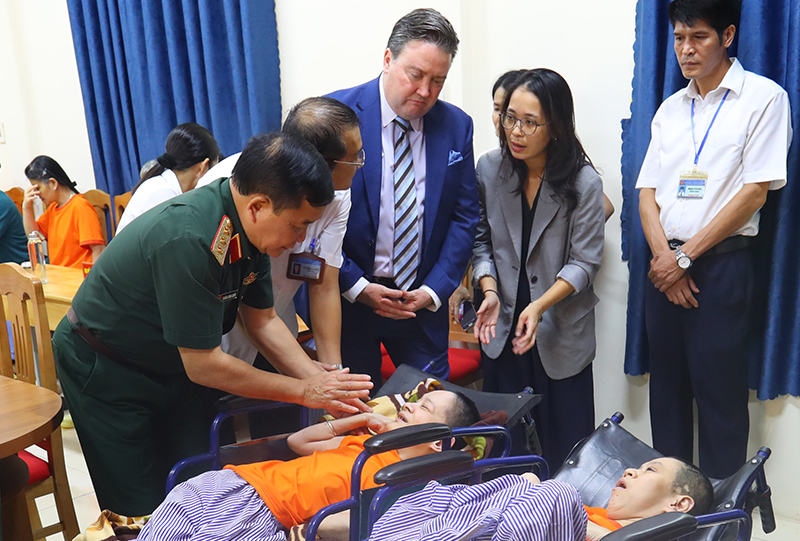 Thượng tướng Hoàng Xuân Chiến, Ủy viên Trung ương Đảng, Thứ trưởng Bộ Quốc phòng và Đại sứ Hoa Kỳ tại Việt Nam Marc Knapper thăm hỏi, động viên nạn nhân chất độc da cam/đi-ô-xin, tháng 8/2024.
