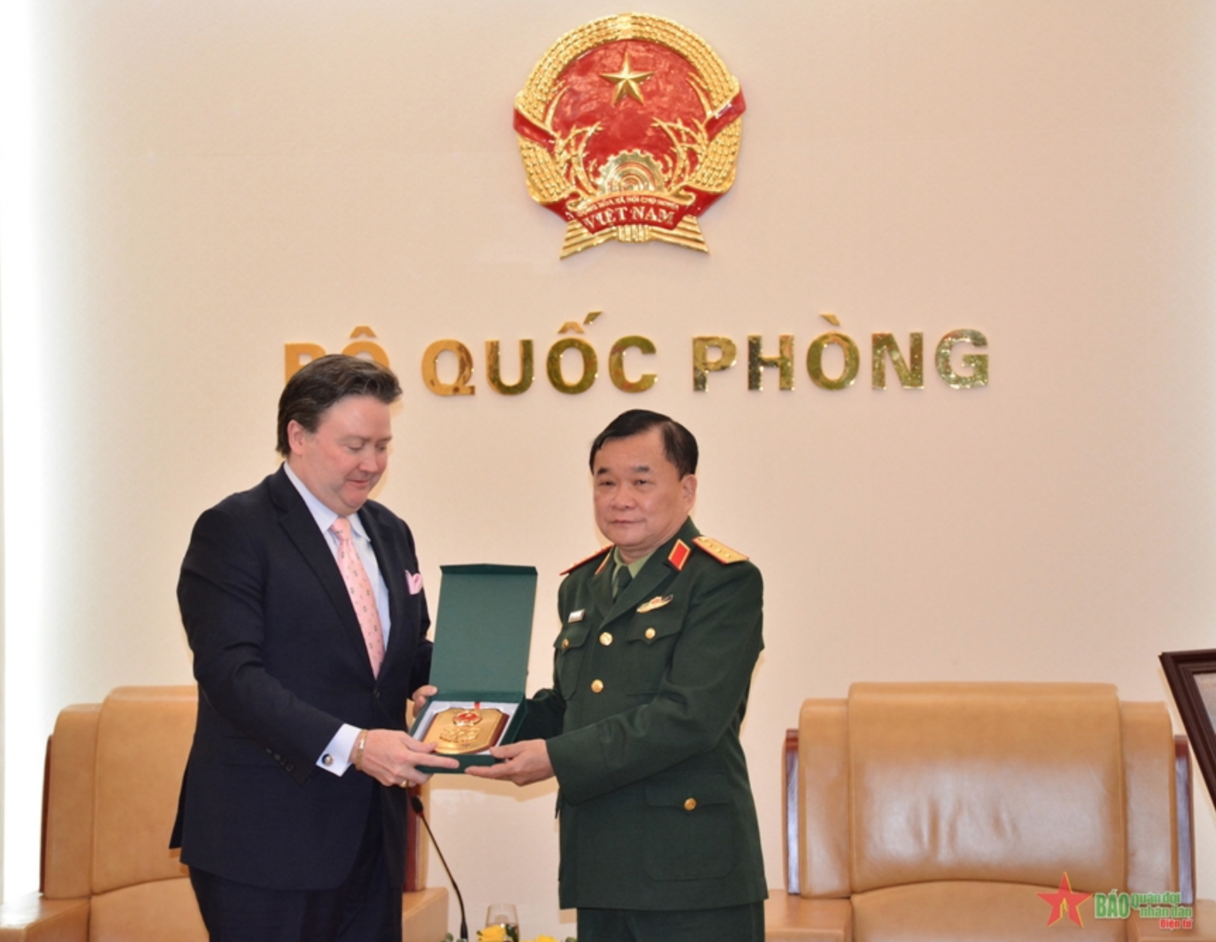 Thượng tướng Hoàng Xuân Chiến trao quà lưu niệm tặng Đại sứ Marc E.Knapper.