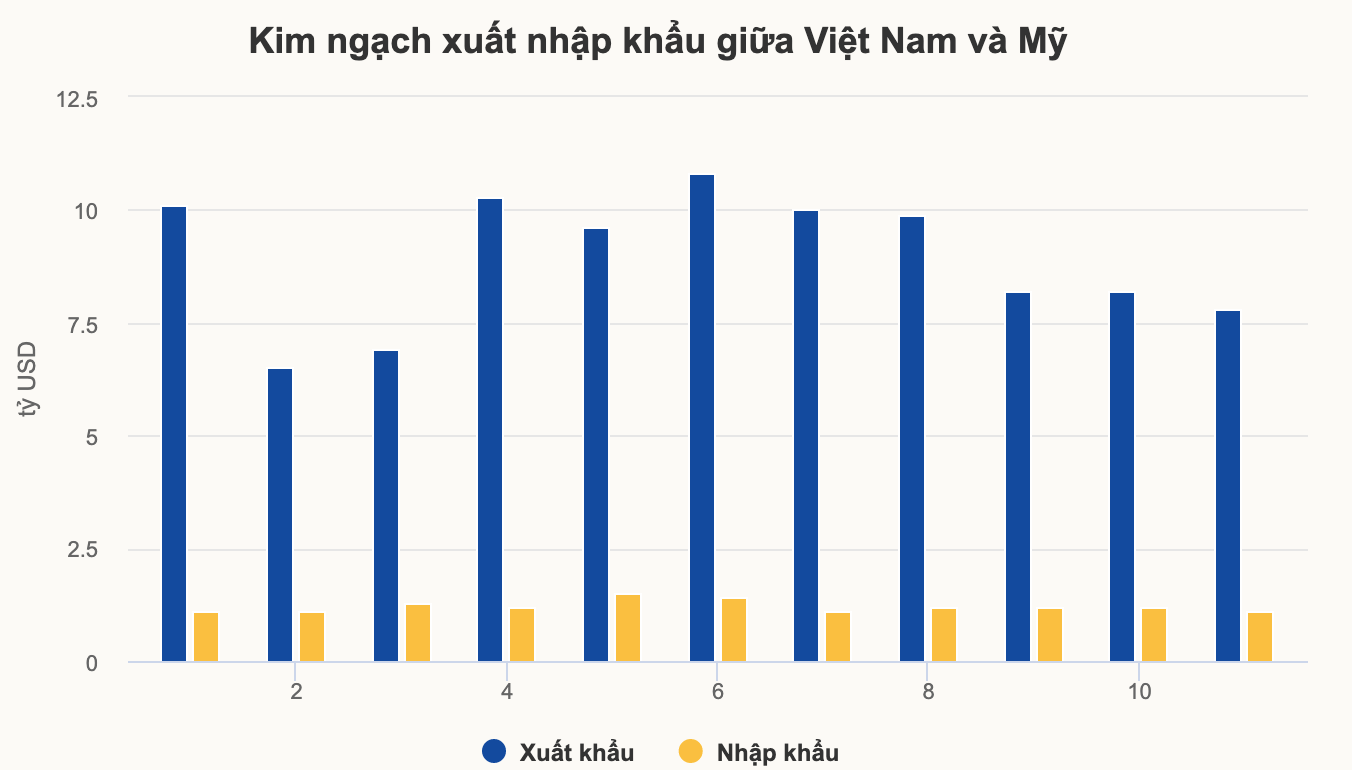 11 tháng năm nay, Mỹ là thị trường xuất khẩu lớn nhất của Việt Nam với kim ngạch ước đạt 101,5 tỷ USD, tăng 18% so với cùng kỳ năm trước, theo Tổng cục Thống kê.