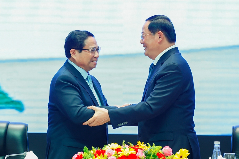 Thủ tướng Phạm Minh Chính và Thủ tướng Lào Sonexay Siphandone tại tại Hội nghị Hợp tác đầu tư Việt Nam – Lào năm 2025 - Ảnh: VGP/Nhật Bắc