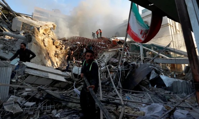 Tòa nhà lãnh sự quán Iran ở thủ đô Damascus, Syria, bị đánh sập sau cuộc tập kích ngày 1/4. Ảnh: AP