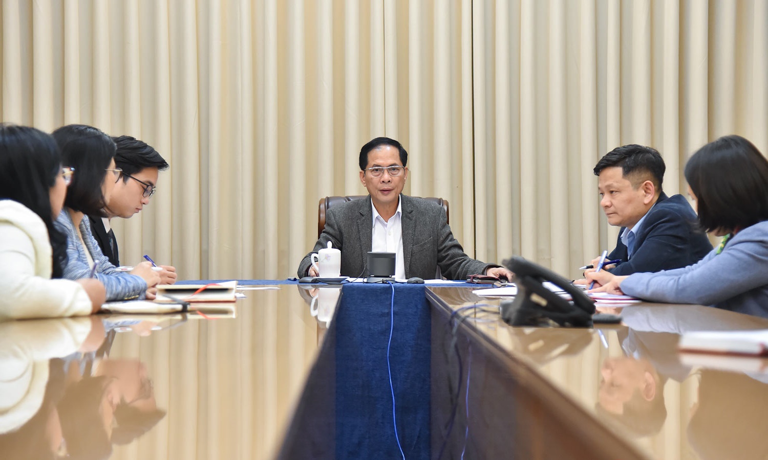 Phó thủ tướng, Bộ trưởng Ngoại giao Bùi Thanh Sơn trong cuộc điện đàm với Ngoại trưởng Ukraine Andrii Sybiha ngày 17/2. Ảnh: BNG