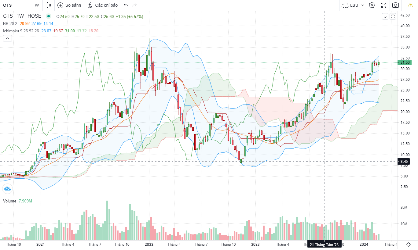 Trên sàn chứng khoán, cổ phiếu CTS ghi nhận sự tăng trưởng tích cực lên tới 165% trong năm 2023, quay trở lại vùng đỉnh 33.450 đồng/CP của thời điểm thị trường thăng hoa.