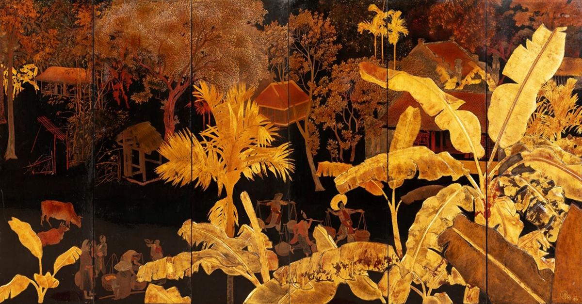 The six-panel lacquered artwork (195x100 centimeters) was sold at the "Art classique, moderne et contemporain session of Drouot Estimations" auction last month.The painting shows cottages and villagers, including street hawkers. While the aforementioned subjects shine dark reddish brown against the black background, the banana trees in the foreground are a sharp contrast of varying shades of yellow. That’s thanks to the gold the artist inlaid into the painting on wood.