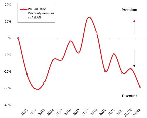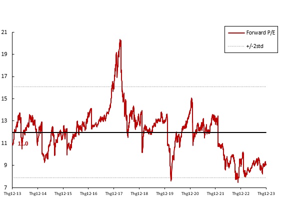 Đối với cổ phiếu ngân hàng, sẽ hưởng lợi từ sự tăng trưởng lợi nhuận, từ khoảng 7% trong năm 2023 lên 18% trong năm 2024 và định giá cổ phiếu ngân hàng tại Việt Nam hiện thấp hơn một độ lệch chuẩn so với trung bình 5 năm (hiện đang giao dịch ở mức khoảng 1.8x P/B so với khoảng 17% ROE dự kiến vào năm 2024).