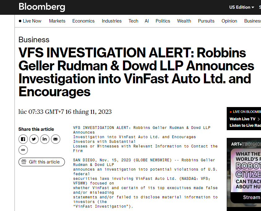 Ngày 16/11, hãng tin Bloomberg đăng thông báo của Robbins Geller Rudman & Dowd LLP về khả năng sẽ mở cuộc điều tra VinFast Auto Ltd..