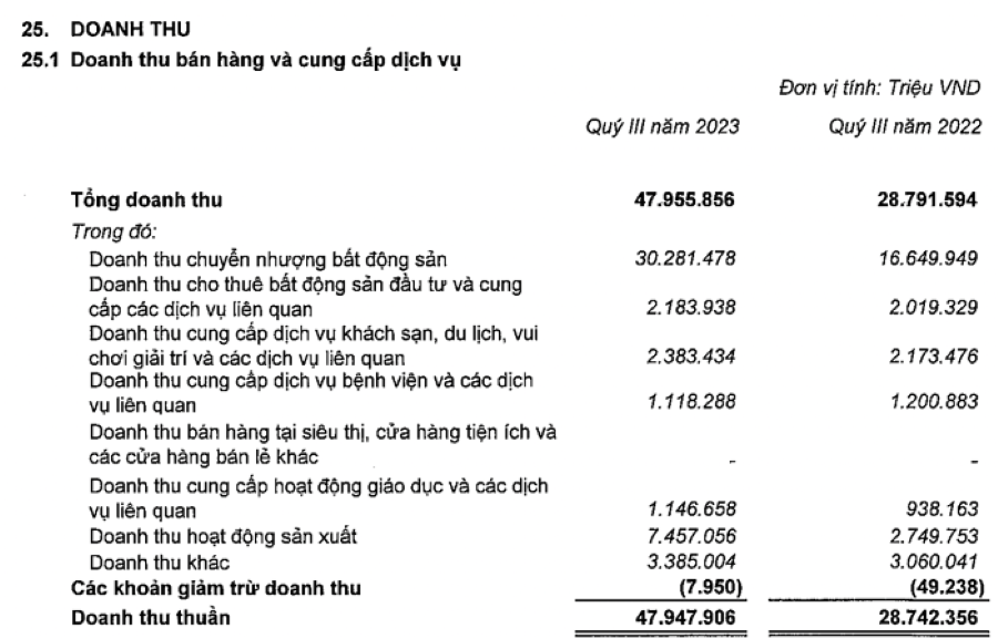 Cụ thể, trong 9 tháng đầu năm 2023, tổng doanh thu thuần hợp nhất của Vingroup đạt 134.207 tỷ đồng, tăng 122% so với cùng kỳ năm trước. Sự tăng trưởng này chủ yếu nhờ tốc độ bàn giao các căn bất động sản thấp tầng tại dự án Vinhomes Ocean Park 2,3 và doanh thu bán xe điện tăng mạnh.