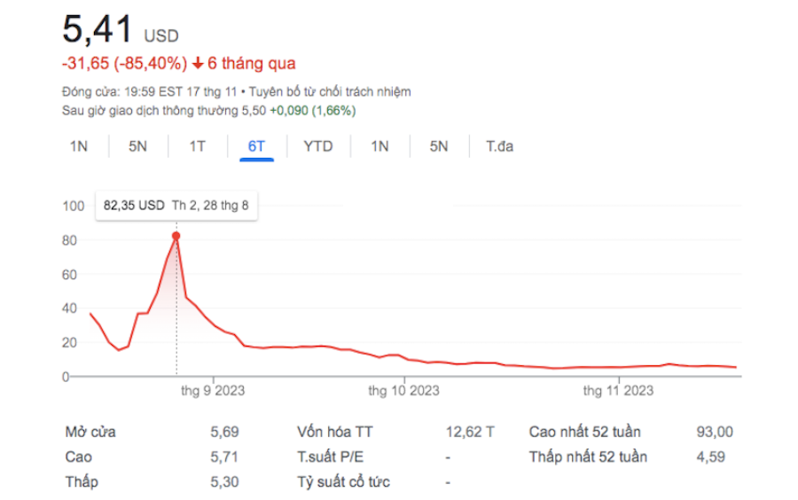 Cổ phiếu phổ thông của VinFast được giao dịch ở mức 6,17 USD/cổ phiếu, giảm hơn 92%