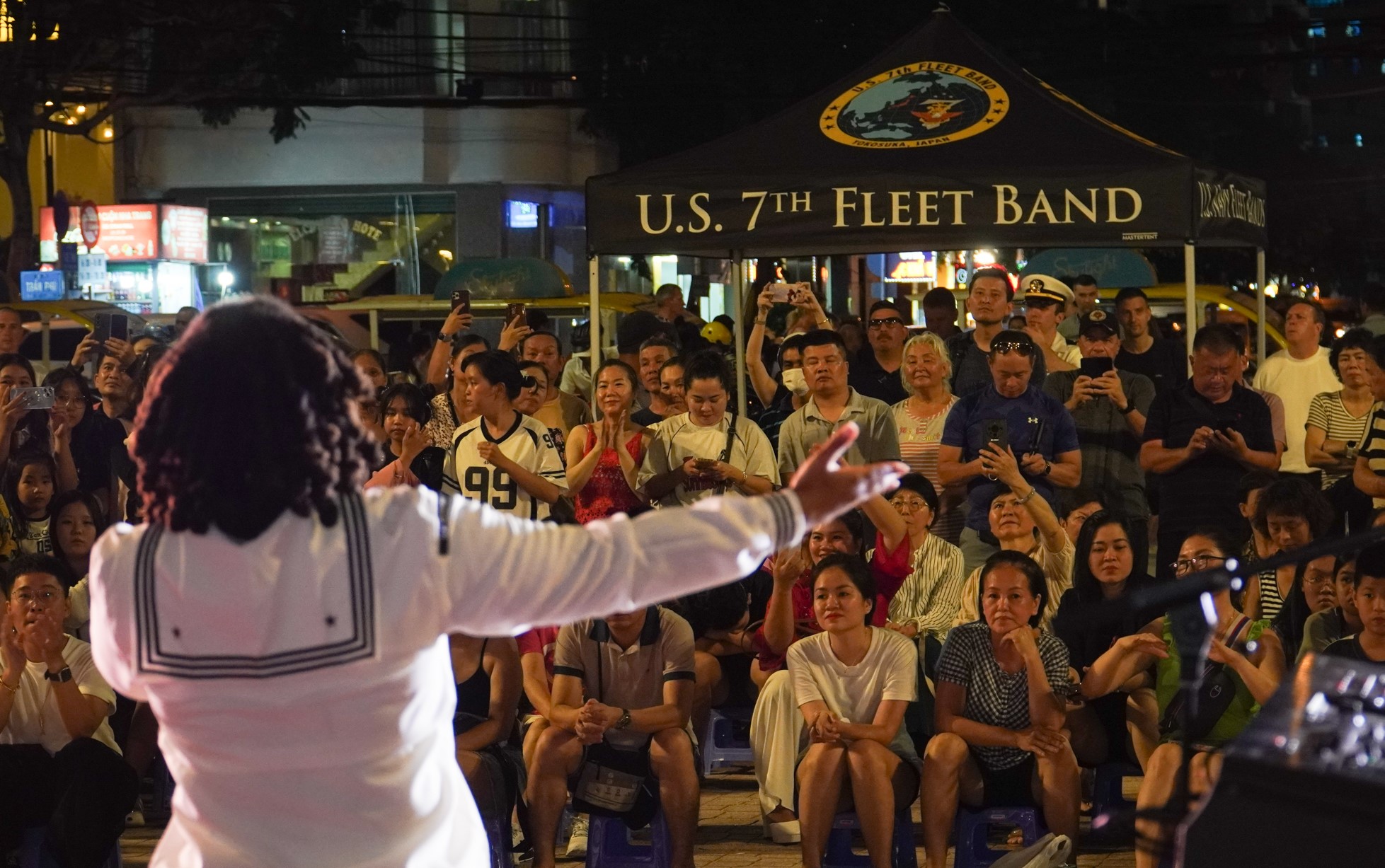 TCVM - Các nhạc công, ca sĩ tàu USS Blue Ridge của Hạm đội 7 Hải quân Hoa Kỳ trình diễn ca khúc "Cứ Chill Thôi" khiến người dân Nha Trang phấn khích trong buổi biểu diễn văn nghệ tại công viên ven biển.