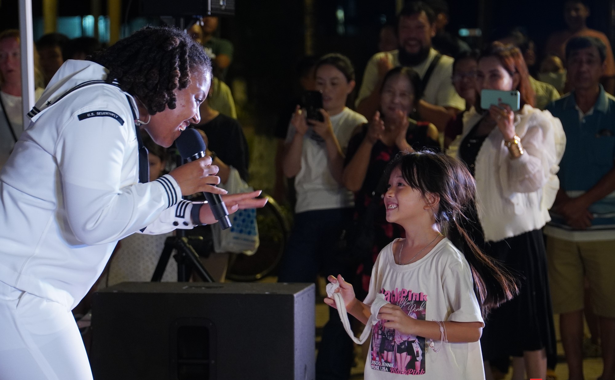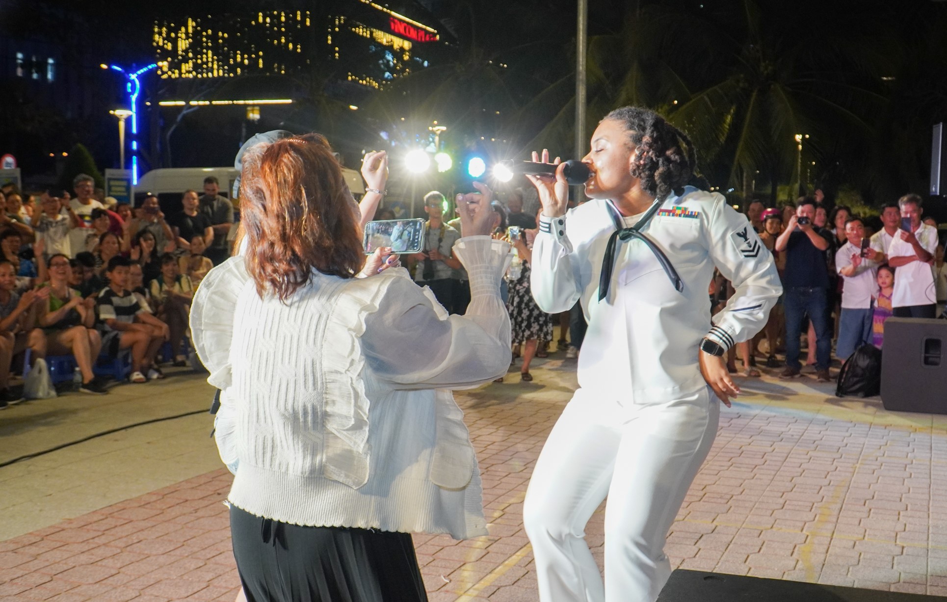 Ca sĩ này bước xuống sân khấu, nhảy múa cùng người dân. “Các tiết mục biểu diễn rất thú vị, thật bất ngờ khi những Hải quân Hoa Kỳ hát tiếng Việt, dù bập bẹ nhưng rất hóm hỉnh. Khi nghe có ban nhạc của Hải quân Hoa Kỳ biểu diễn, chúng em đã cùng nhau xuống theo dõi”, bạn Nguyễn Khánh Linh, sinh viên trường đại học Khánh Hòa, nói.