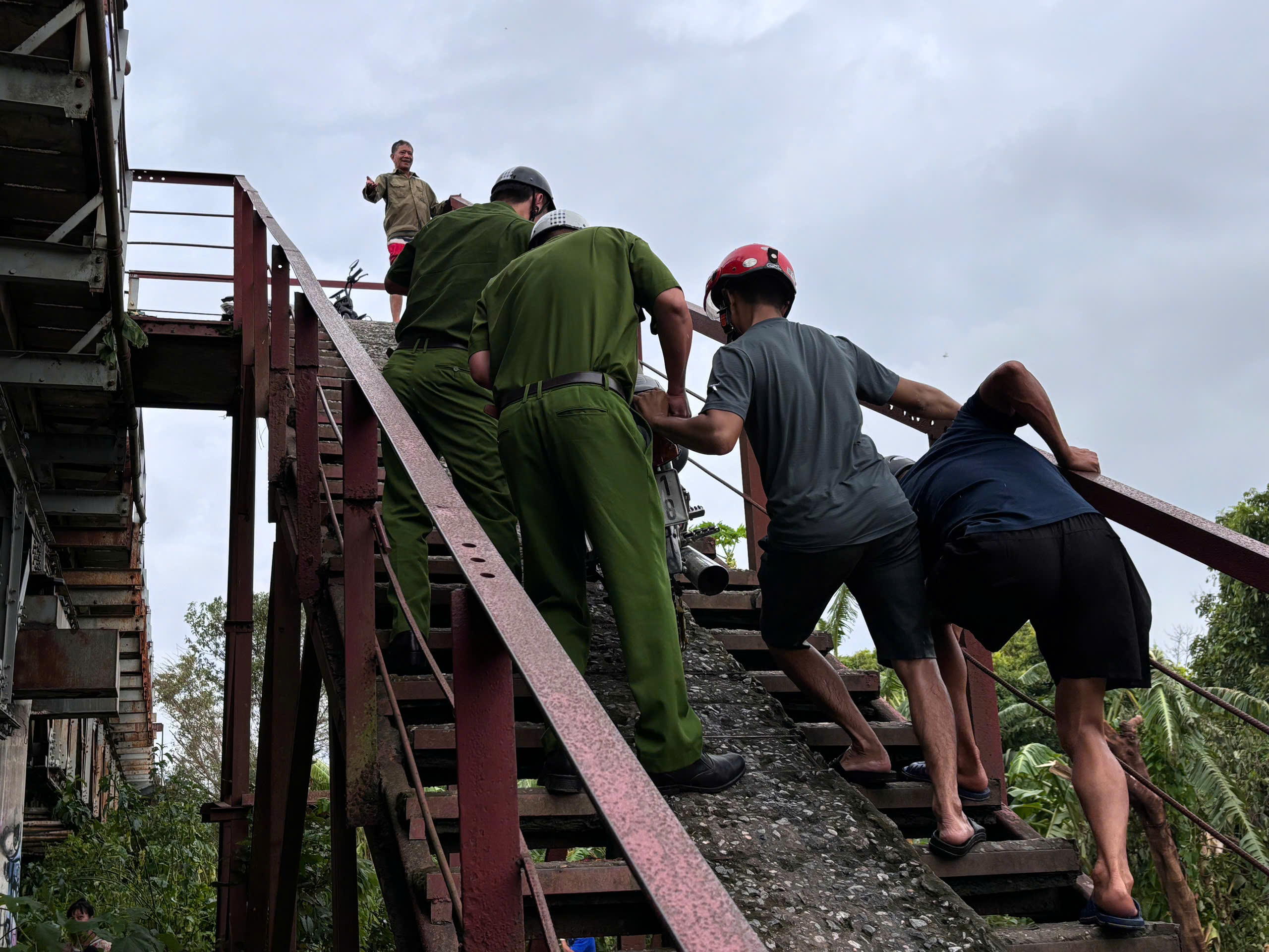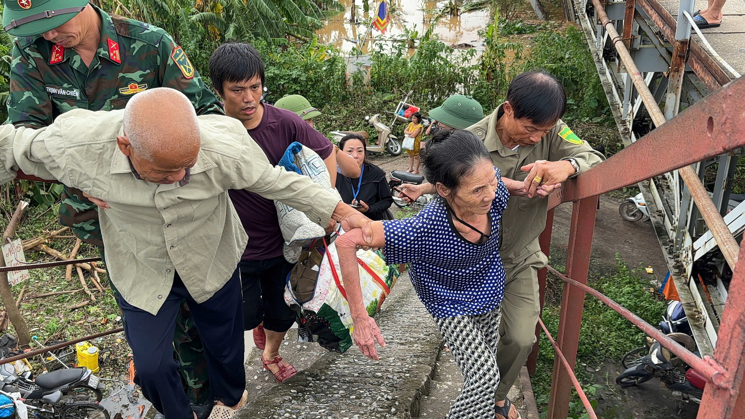 Xóm nhỏ dưới chân cầu Long Biên lúc này có phần hỗn loạn, tiếng xe máy di chuyển liên tục để đưa người đến vùng an toàn, tiếng gia súc gia cầm thi nhau hò một góc. Tiếng người với người to tiếng, thúc giục vì sự an toàn của đồng bào, vừa khóc, chị B. vừa nói "Đi, đi thôi, chứ ở đây đêm nay có mà chết cả lũ mất. Đây này, nước nó dâng cao thế này rồi cơ mà. Lũ lên nhanh khủng khiếp, hồi sáng đã lên cao thế này đâu, giờ tràn cả vào lối mòn rồi. Chẳng mấy chốc lũ nhấn chìm cả khu này mất."