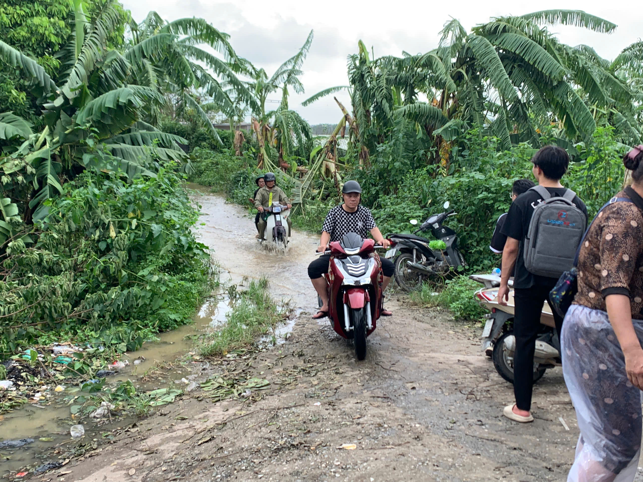 Nước sông Hồng dâng cao, hiện đã gây ngập úng con đường mòn vào xóm nhỏ