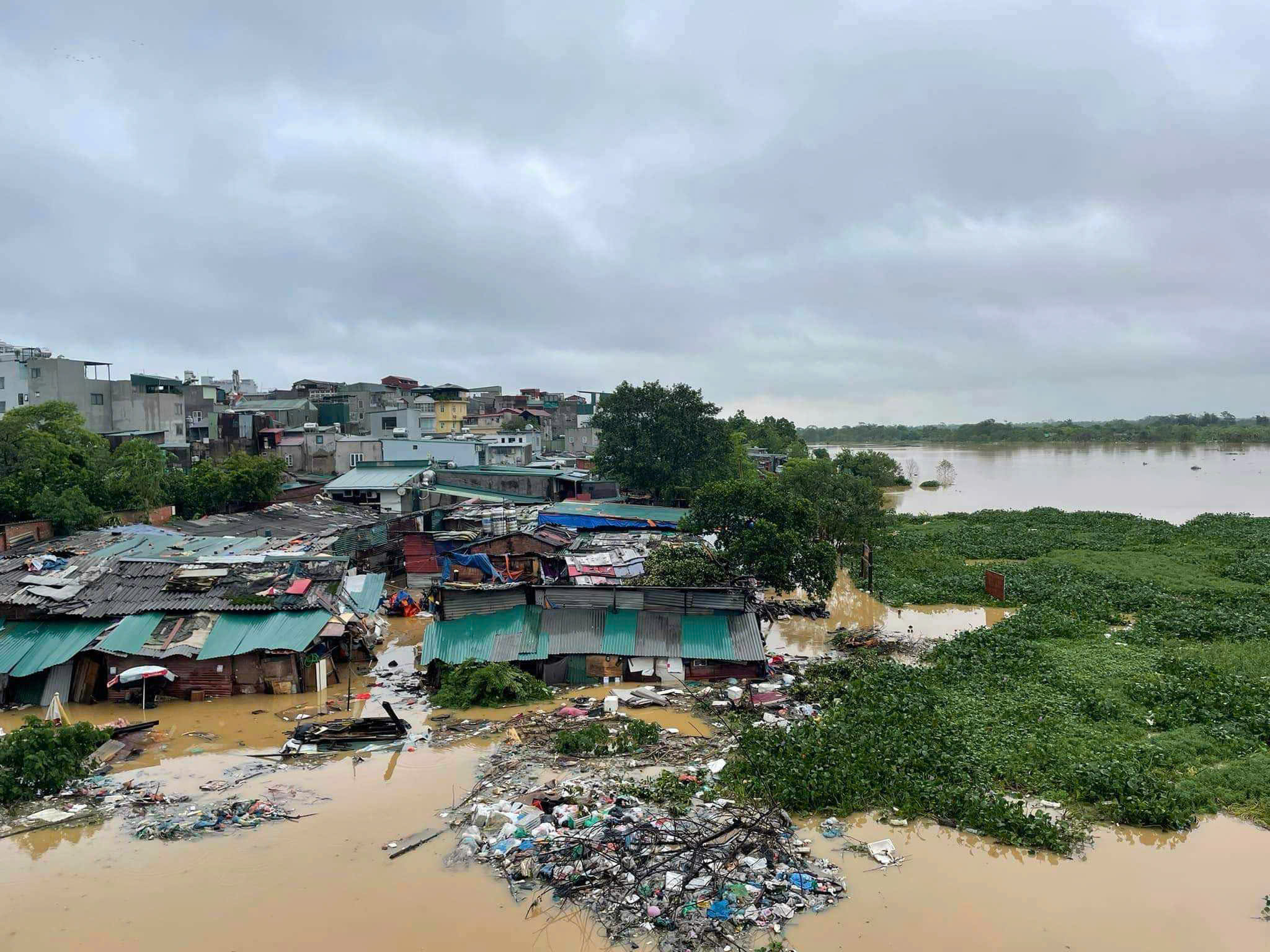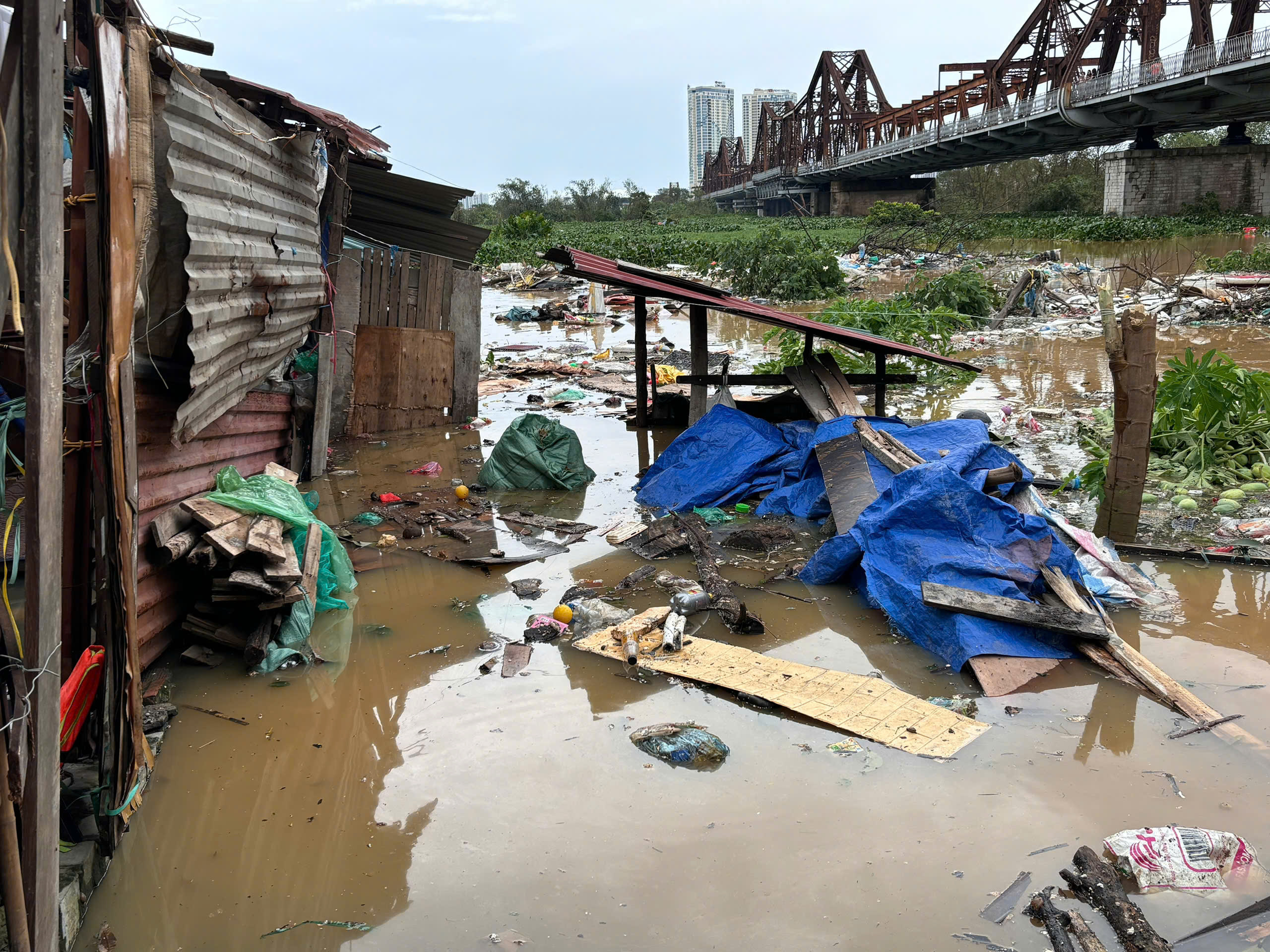 Rác thải nổi lềnh bềnh quanh khu vực nhà dân chìm trong nước lũ dưới chân cầu Long Biên